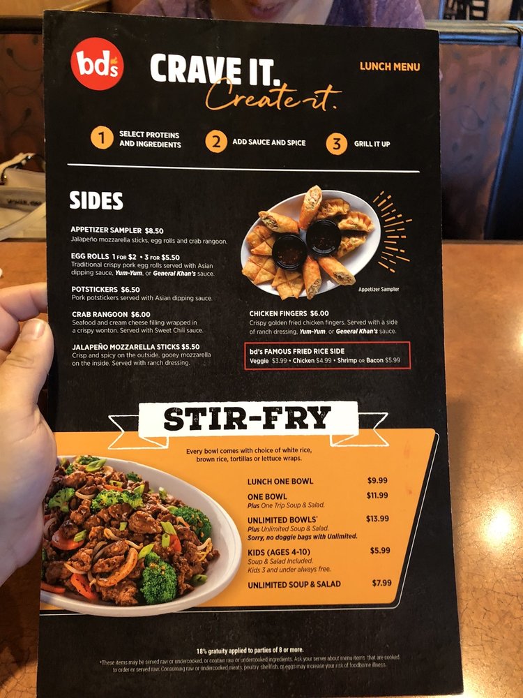 BD's Mongolian Grill in Columbus, Ohio offers a variety of options for a delicious dining experience. Their menu includes signature stir-fry bowls like the BD's Orange Chicken and General Tso's Chicken Bowl, as well as limited-time offers such as Chinese Fried Shrimp and Honey Walnut Shrimp. The starters and sides selection features BD's Famous Fried Rice, Cauliflower Fried Rice, and the BD's Signature Sampler for those looking to share. With vegan and vegetarian options, as well as happy hour specials and a full bar, BD's Mongolian Grill caters to a wide range of preferences. The casual atmosphere, outdoor seating, and dog-friendly policy make it a great choice for lunch or dinner with friends and family. Don't miss out on their unique dishes and flavorful combinations at BD's Mongolian Grill.